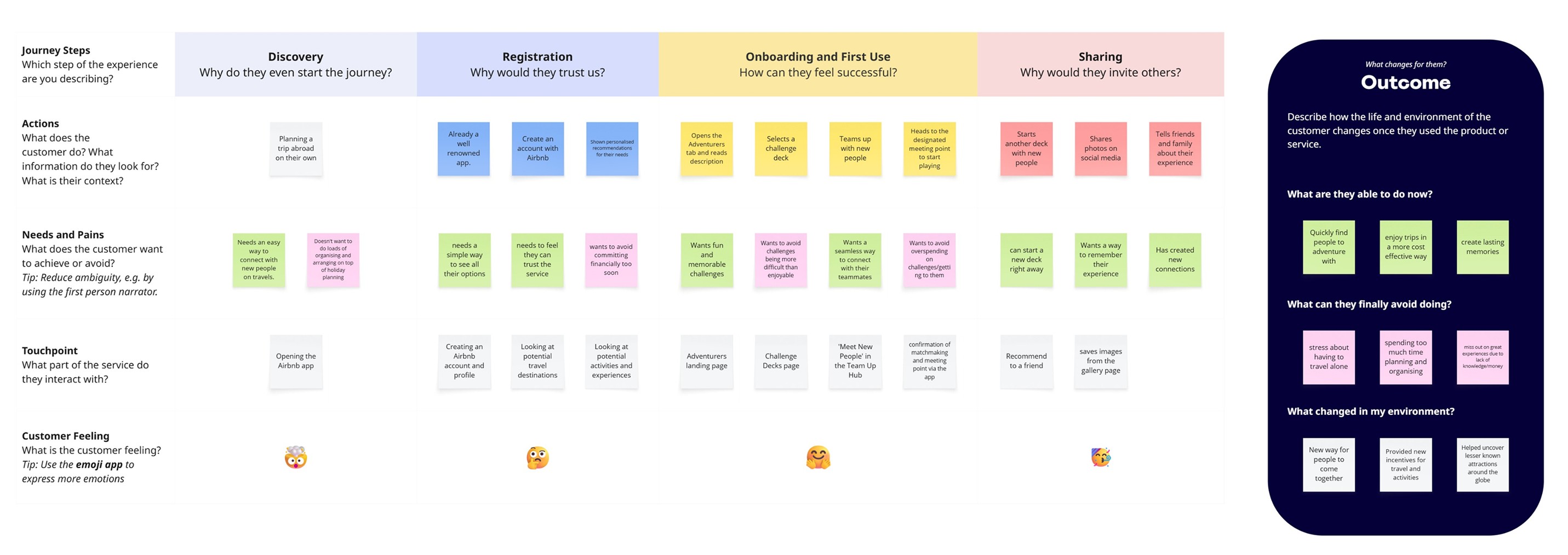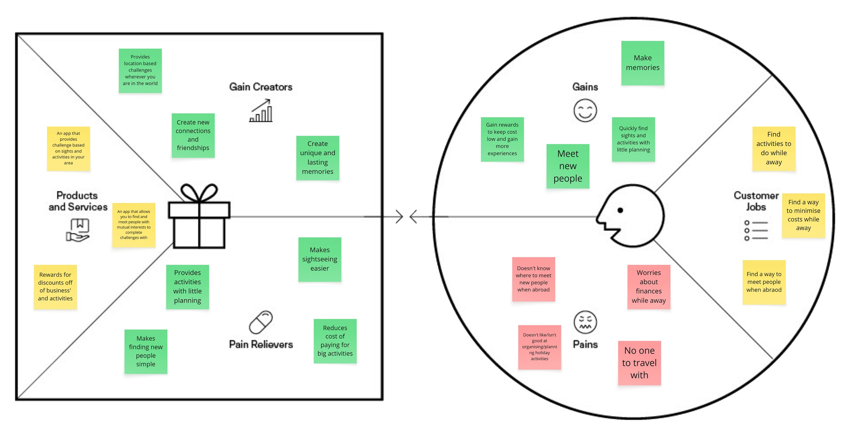 The Value Proposition Canvas also helped in uncovering the key factors that users would hope to gain from my product and the pains they wanted to fix. This highlighted how important simplicity needed to be when using the app. As being in a potentially unknown place without set plans can already be stressful. It was important to make the app reliable and trustworthy.