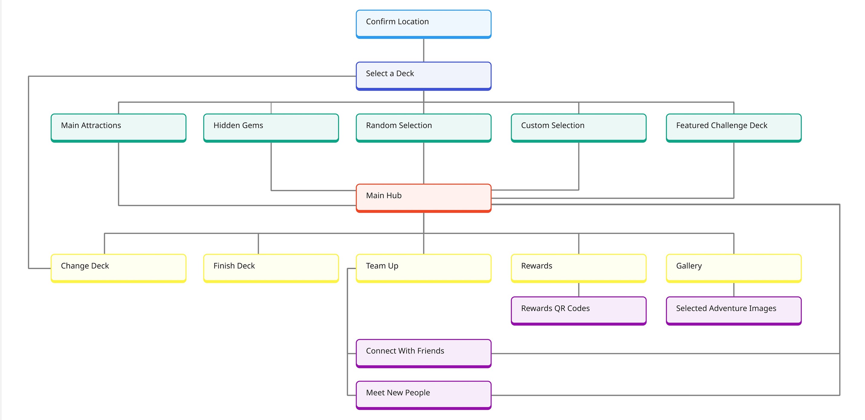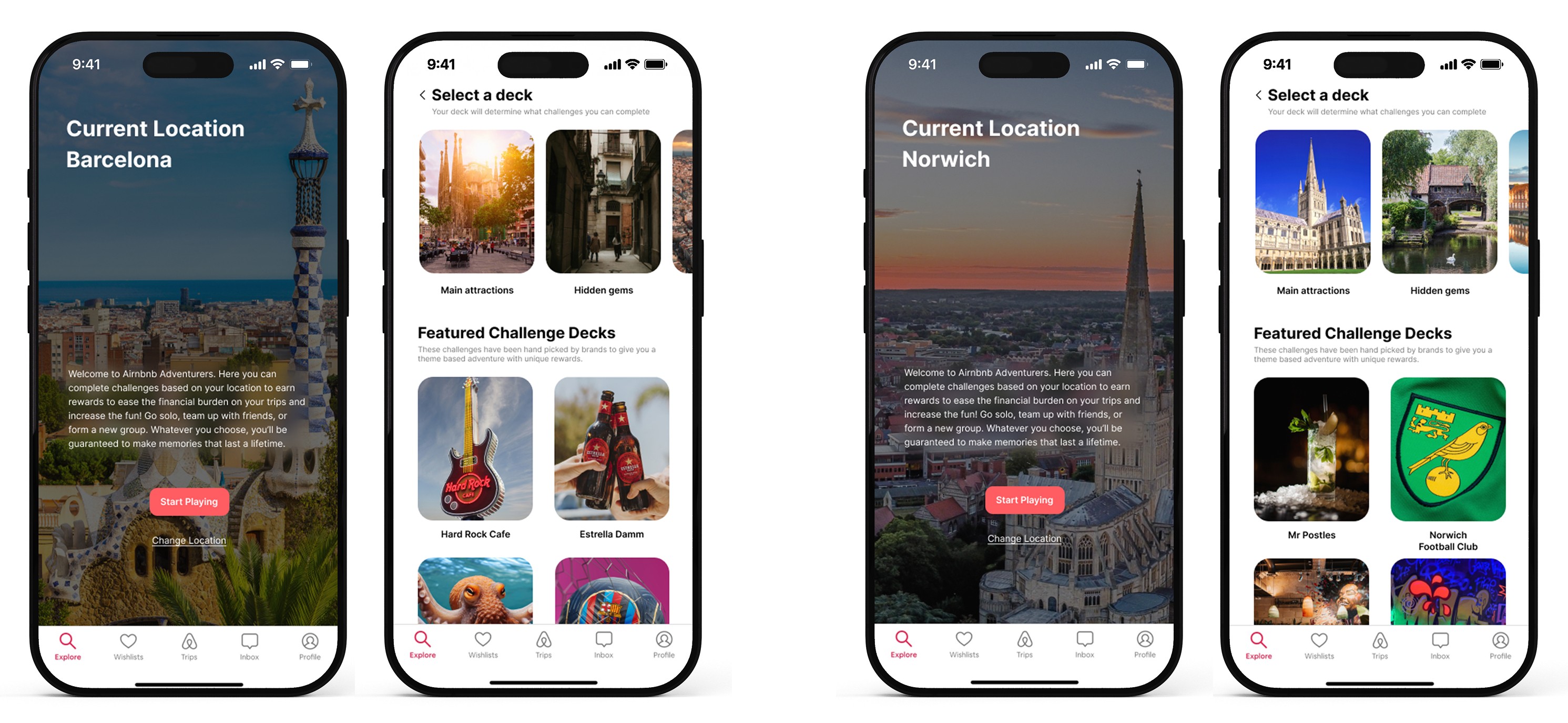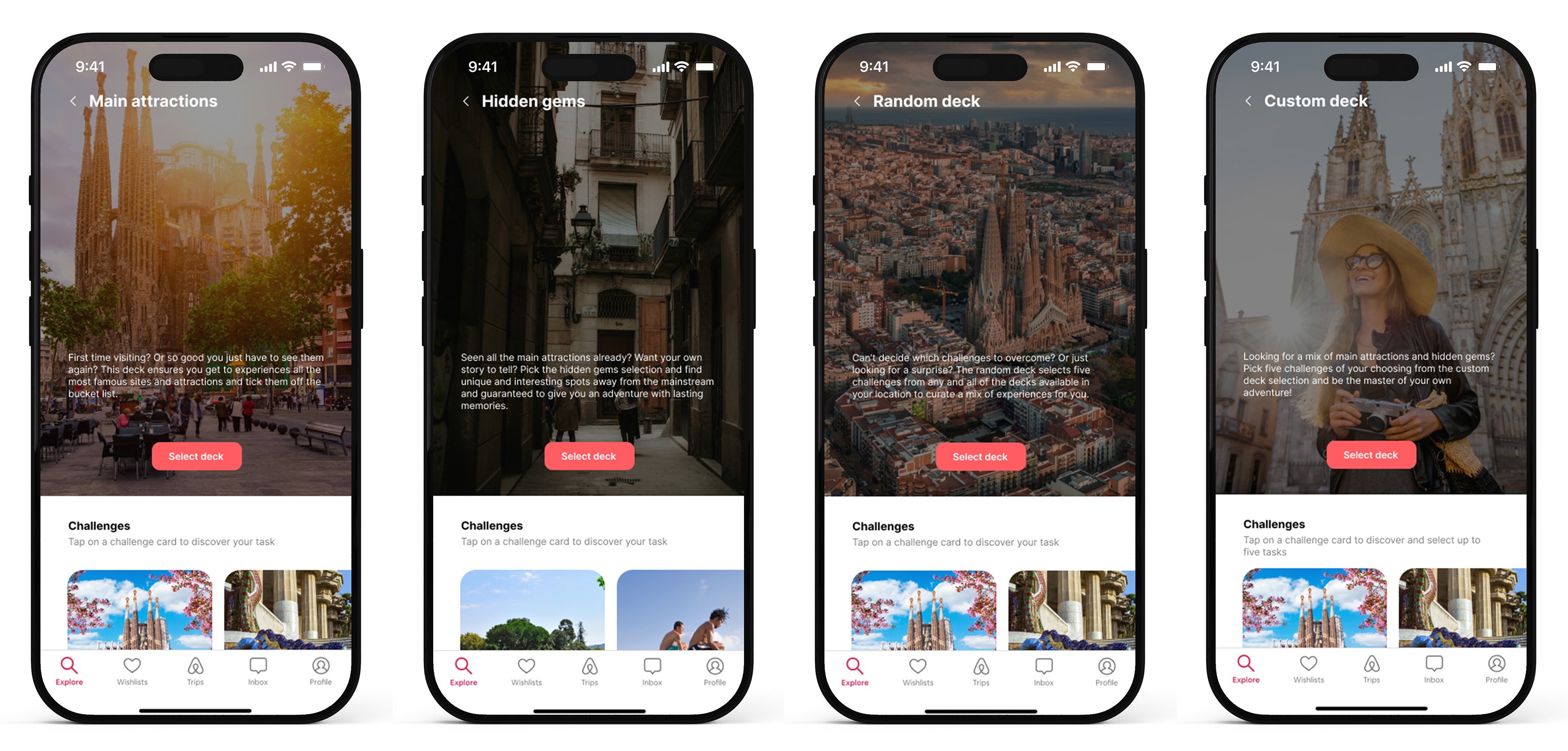 Decks - Each deck has a set of challenges to be completed themed around its locations and sights. It could be reaching the top of a landmark, finding a native animal or creating a location specific outfit. Completing challenges rewards users with vouchers and discounts for other experiences and businesses in the area.