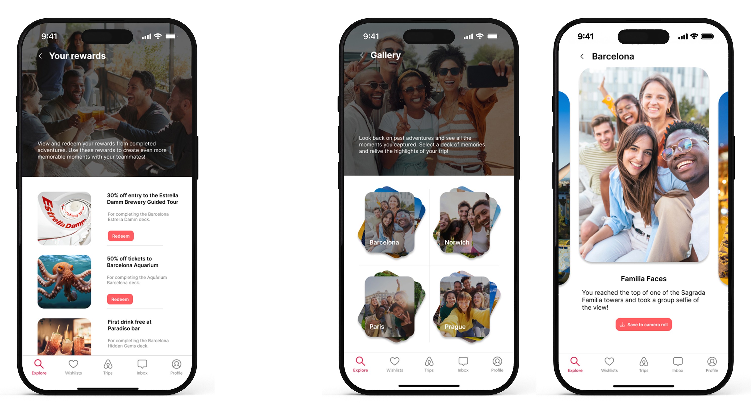 Rewards & Gallery - Rewards from completed decks are stored in their own section and provide teams with access to new experiences at reduced costs to maximise the memories from their trip. When decks are completed, all submitted challenge images are sent to the gallery. This gives the users a permanent way to remember and relive all their adventures.
