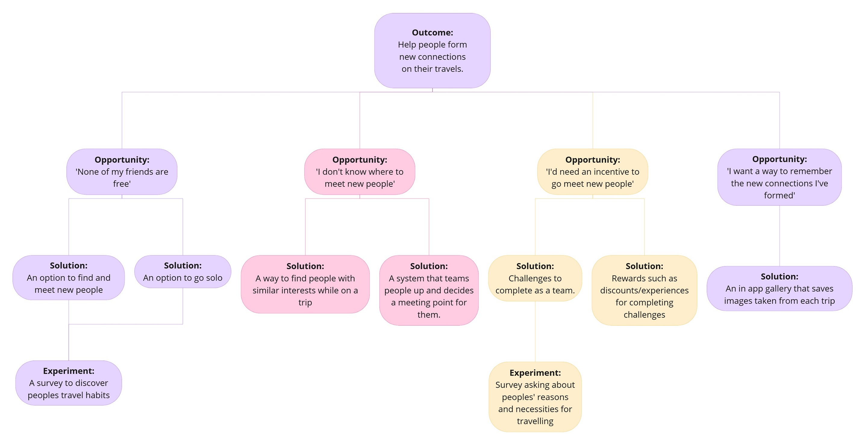 An Opportunity Solution Tree was the next step in focussing on the needs of the user and how I could achieve them. I wanted to find as many avenues to forming connections between people as possible whilst also making it just as enjoyable to use alone. Challenges, team objectives, rewards for completion and photo albums were the main features I set out to include.