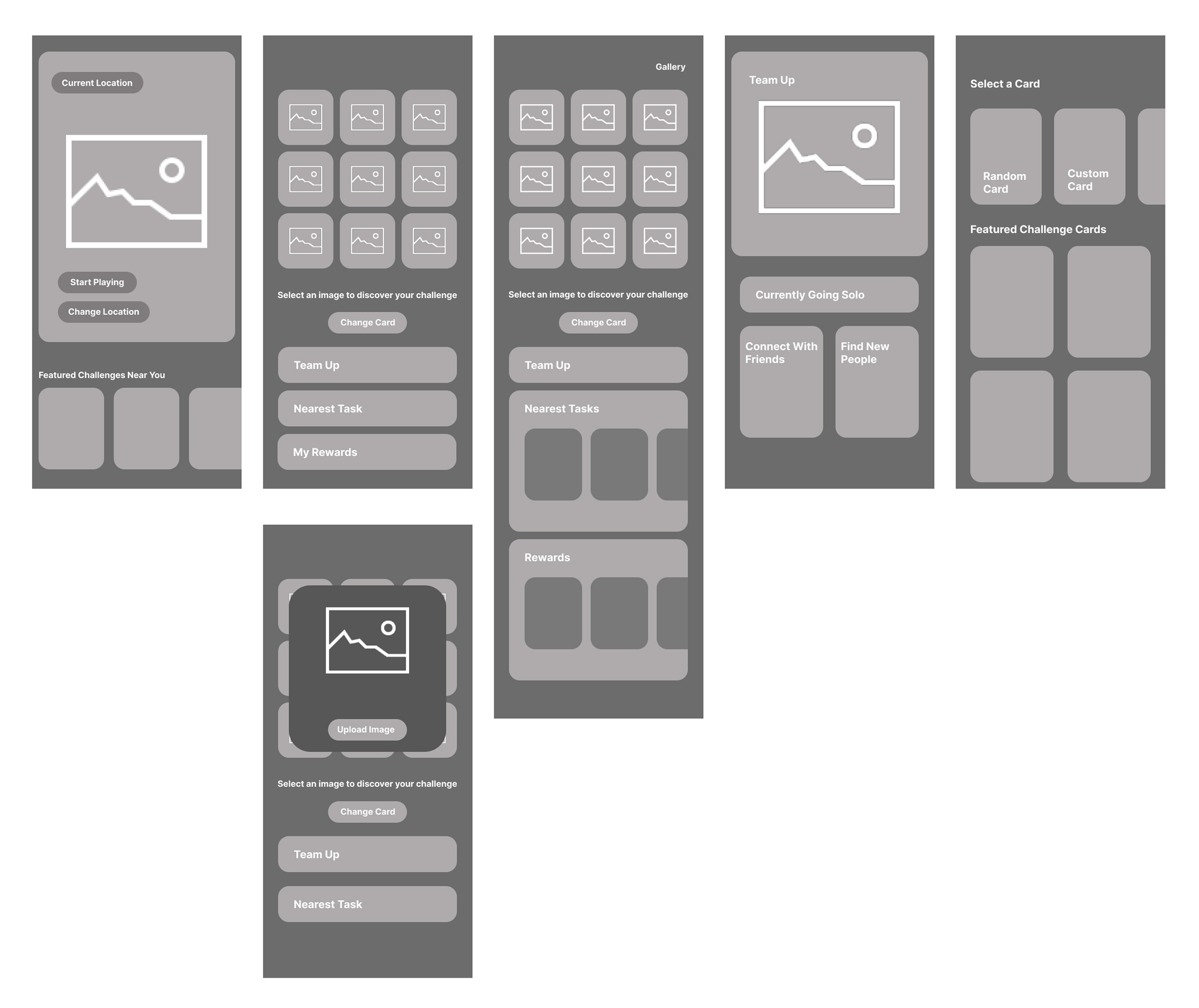 This is where users can see their active deck challenges and, once teaming up, their team members. Tapping the challenge image flips the card to reveal the challenge description and the option to submit a photo to complete said challenge.