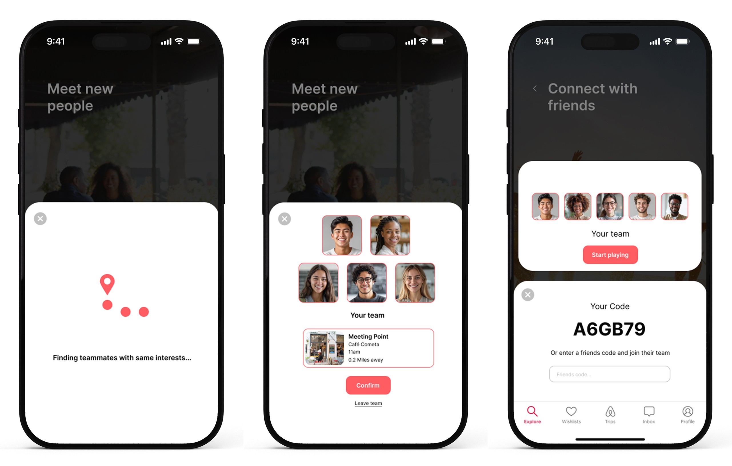It was important to maintain Airbnb’s Branding throughout the app. I intended to achieve this through strong colour iconography and tone of voice. By making the app clearly in association with Airbnb, I hoped to achieve a sense of trust and friendliness from the user. By creating a safe space for the user it would be easier to help them take the leap and connect with new people.
