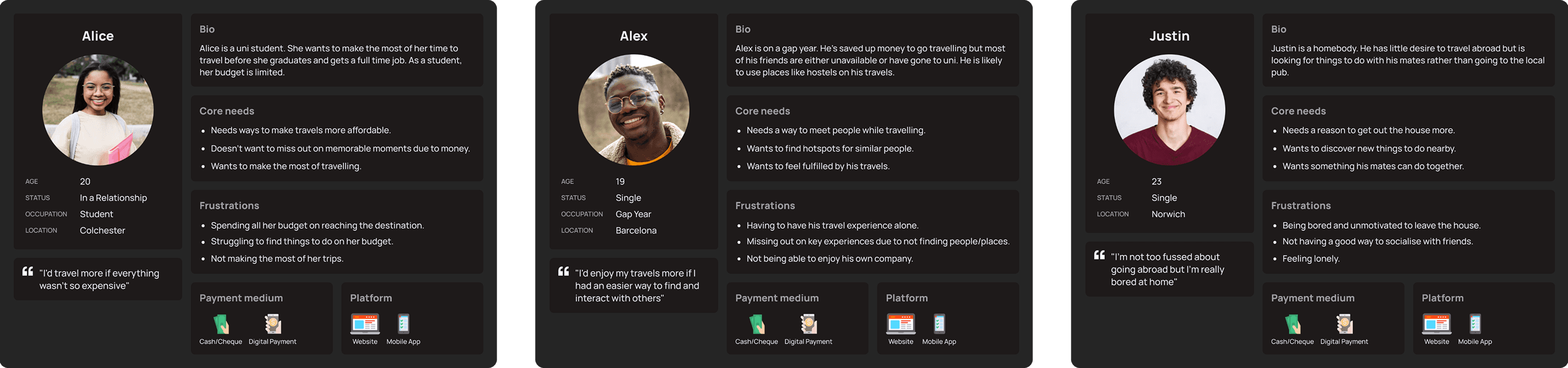 Personas helped to determine the wants and needs of potential users. This allowed me to figure out specific user difficulties and frustrations I should cater to. After comparing three different types of potential users it was clear that the core aim of my product needed to be to provide users with an affordable way to form meaningful connections with places and people.